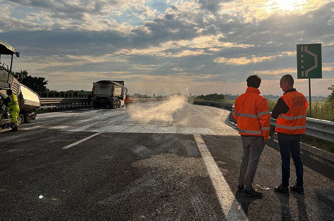 Fassaroad, our lime slurry-based suspension, is a significant innovation for roadworks. This aqueous suspension of concentrated, stabilised hydrated lime not only improves adhesion between the new road surface and the underlying layer but also helps control emulsion temperature and reduce dust formation during works, ensuring a safer and cleaner working environment.
